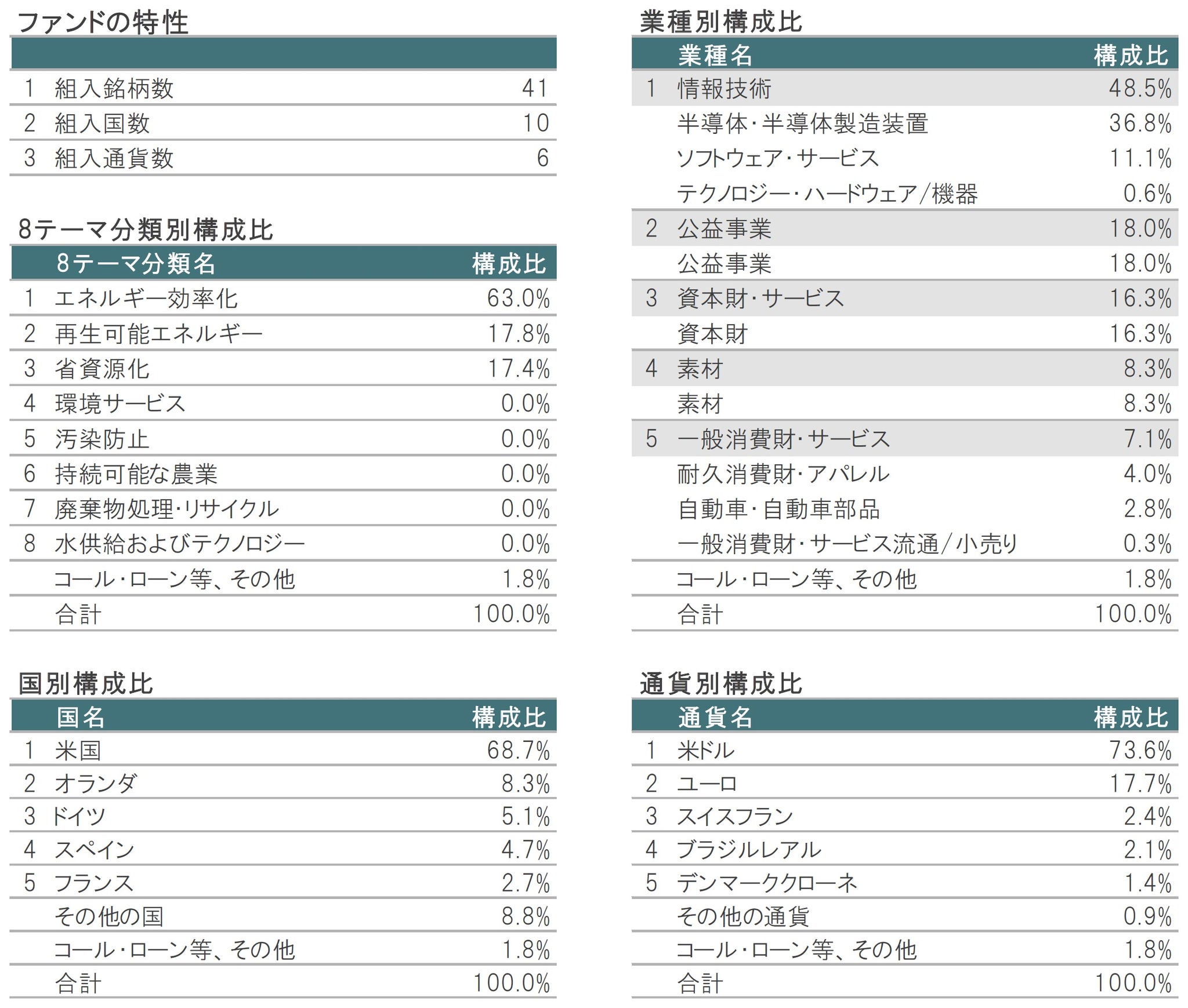 8テーマ分類別構成比については、エネルギー効率化が63.0%、再生可能エネルギーが17.8%、省資源化が17.4%などとなっています。業種別構成比( GICS第1分類)については、情報技術の比率が48.5%と全体の半分近くを占めていますが、組入業種は多岐にわたります。