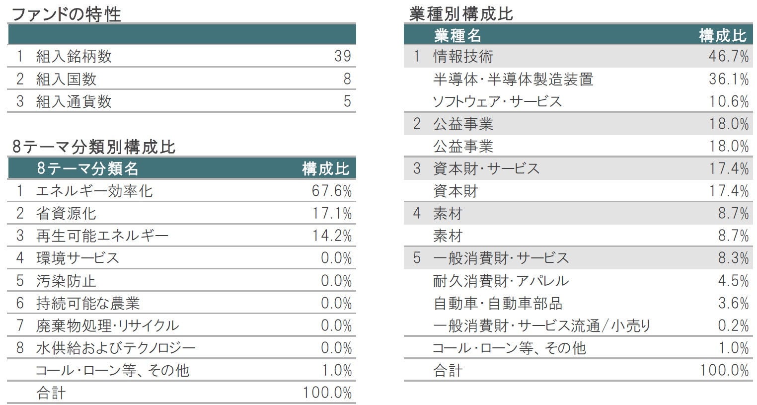 ※上記は当ファンドの主たる投資対象であるピクテ・エコディスカバリー・アロケーション・マザーファンドの状況です。 ※8テーマ分類は当ファンド独自の分類で分類・表示しています。8テーマ分類は以下のとおりです。(1)エネルギー効率化、(2)省資源化、(3)再生可能エネルギー、(4)環境サービス、(5)汚染防止、(6)持続可能な農業、(7)廃棄物処理・リサイクル、(8)水供給およびテクノロジー。このうち、現在、当ファンドが注目しているのは、(1)エネルギー効率化、(2)省資源化、(3)再生可能エネルギーの3テーマです。 ※業種名はGICS第1分類および第2分類で表示しています。 ※表で示した組入銘柄は、特定の銘柄の勧誘や売買の推奨等を目的としたものではなく、その価格動向を示唆するものでもありません。