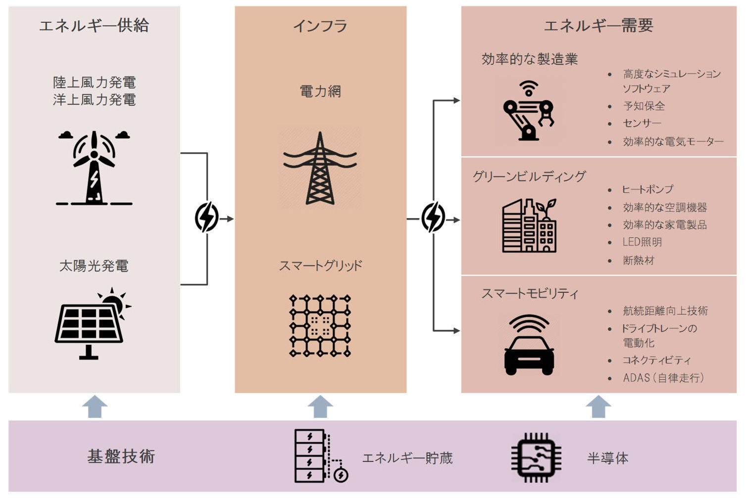 エネルギー貯蔵(蓄電池)や半導体は、上記のエコシステム全体で必要とされる「基盤技術」と位置付けています。半導体デバイスとしては、電気自動車などで用いられる次世代パワー半導体や、電力効率に優れる人工知能(AI)向けカスタム半導体などに注目しています。このほか、低消費電力を実現する先端半導体の設計支援サービスや、半導体製造装置などにも注目しています。
