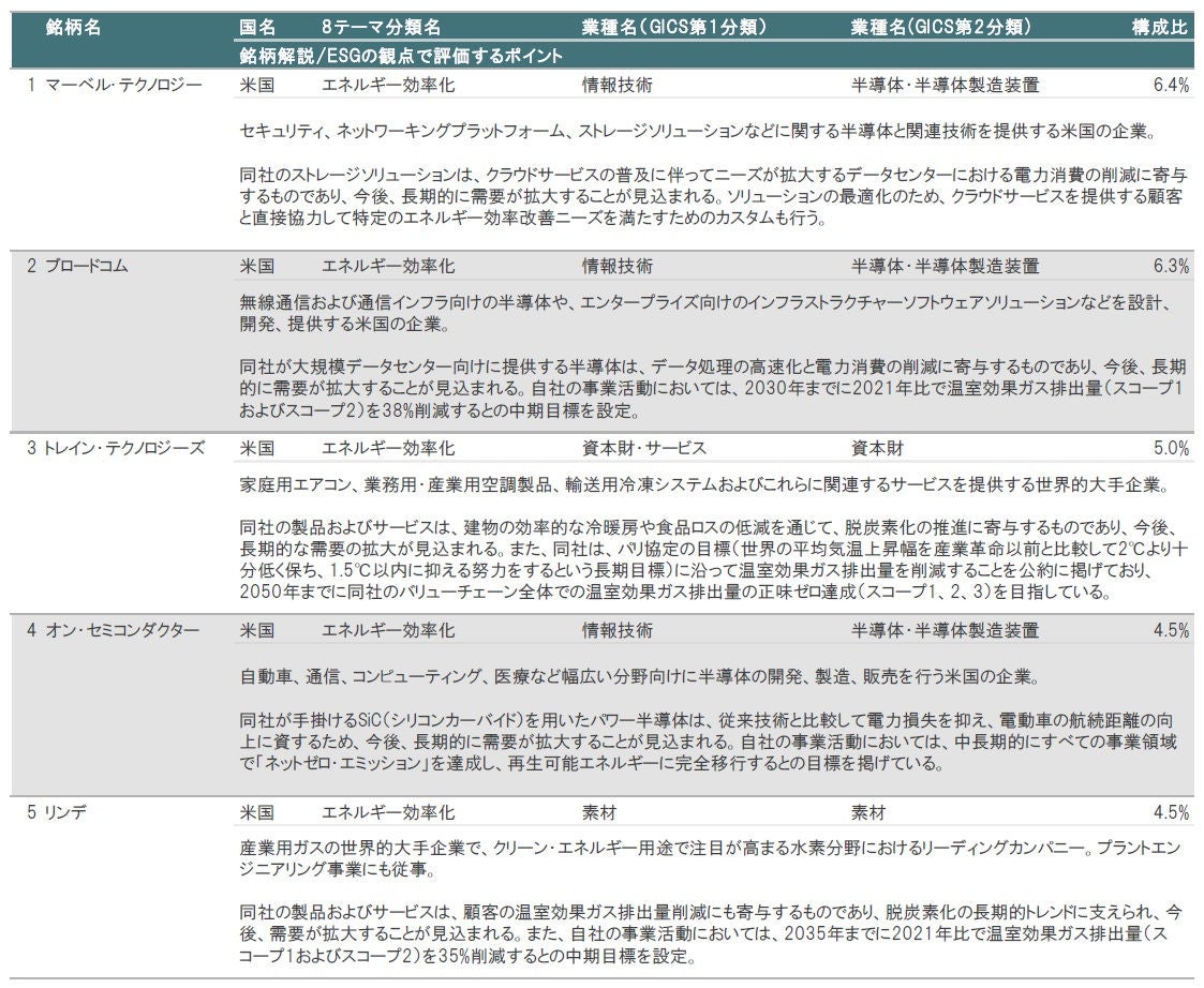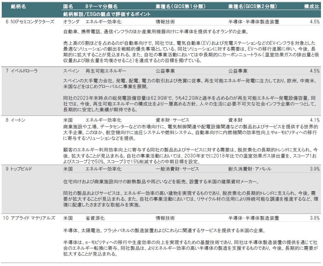 図表3、4に示したとおり、2024年12月末時点の組入上位10銘柄の内訳は、①8テーマ分類別では、エネルギー効率化が8銘柄、再生可能エネルギーが1銘柄、省資源化が1銘柄、②業種別(GICS第1分類)では、情報技術が5銘柄、資本財・サービスが2銘柄、素材が1銘柄、公益事業が1銘柄、一般消費財・サービスが1銘柄となっています。