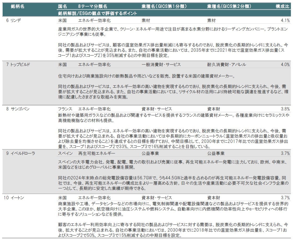 図表3、4に示したとおり、2025年8月末時点の組入上位10銘柄の内訳は、①8テーマ分類別では、エネルギー効率化が8銘柄、再生可能エネルギーが2銘柄、②業種別(GICS第1分類)では、資本財・サービスが4銘柄、情報技術が3銘柄、素材が1銘柄、一般消費財・サービスが1銘柄、公益事業が1銘柄となっています。