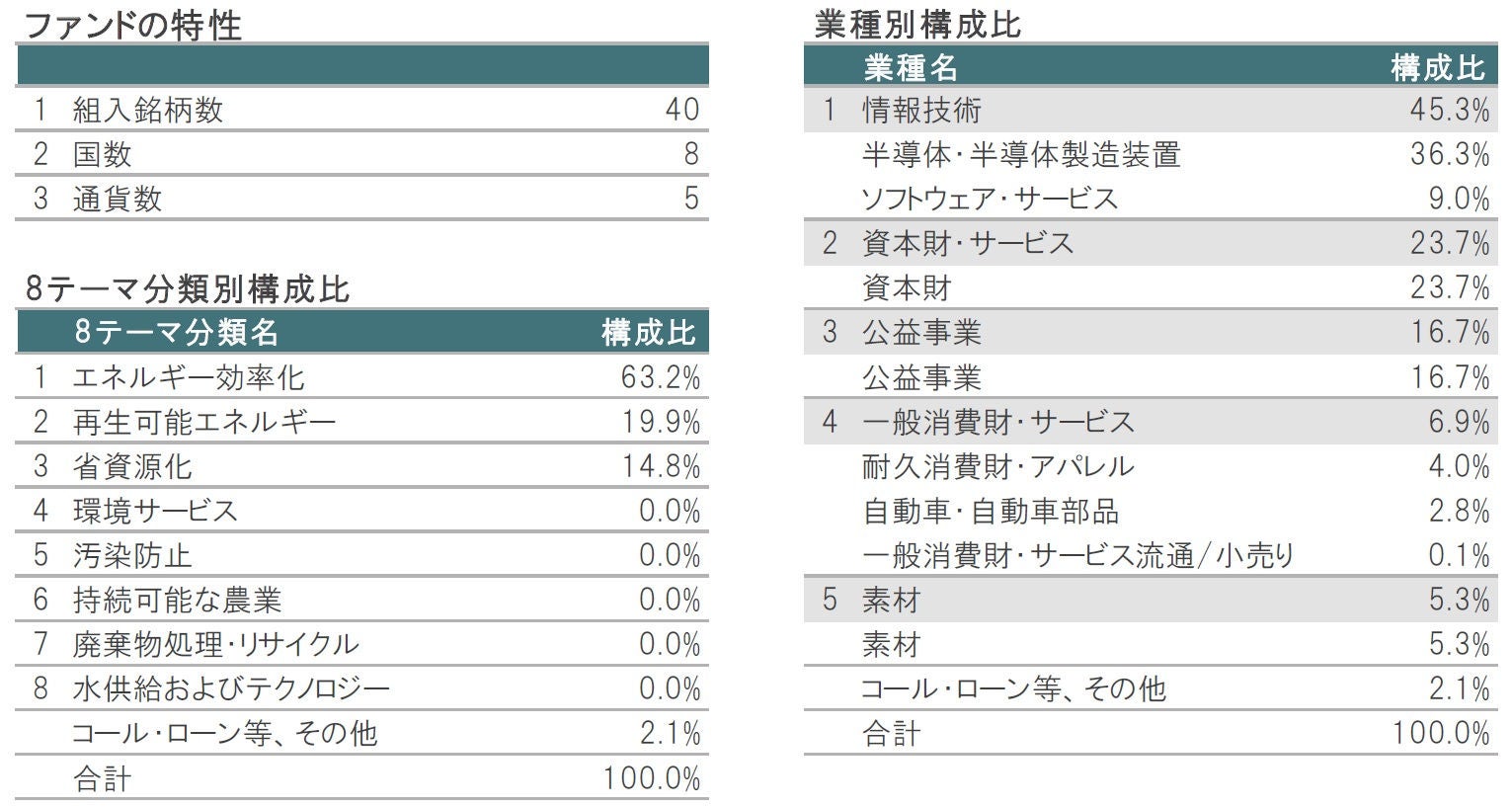 ※上記は当ファンドの主たる投資対象であるピクテ・エコディスカバリー・アロケーション・マザーファンドの状況です。 ※8テーマ分類は当ファンド独自の分類で分類・表示しています。8テーマ分類は以下のとおりです。(1)エネルギー効率化、(2)省資源化、(3)再生可能エネルギー、(4)環境サービス、(5)汚染防止、(6)持続可能な農業、(7)廃棄物処理・リサイクル、(8)水供給およびテクノロジー。このうち、現在、当ファンドが注目しているのは、(1)エネルギー効率化、(2)省資源化、(3)再生可能エネルギーの3テーマです。 ※業種名はGICS第1分類および第2分類で表示しています。 ※表で示した組入銘柄は、特定の銘柄の勧誘や売買の推奨等を目的としたものではなく、その価格動向を示唆するものでもありません。