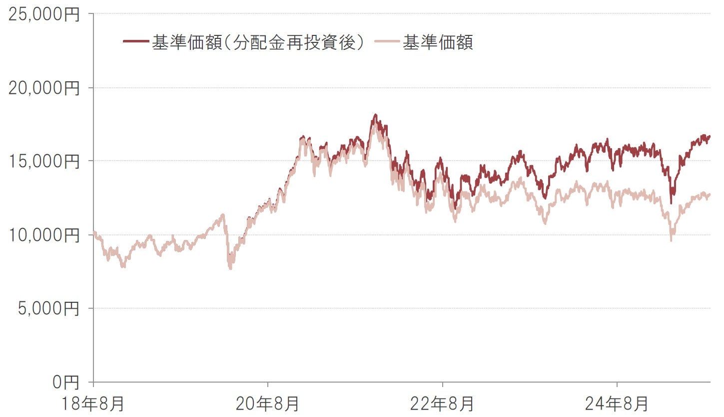 ※基準価額は1万口当たり、実質的な信託報酬等控除後。基準価額(分配金再投資後)は、購入時手数料等を考慮せず、税引前分配金を再投資した場合の評価額を表します。換金時の費用・税金等は考慮していません。