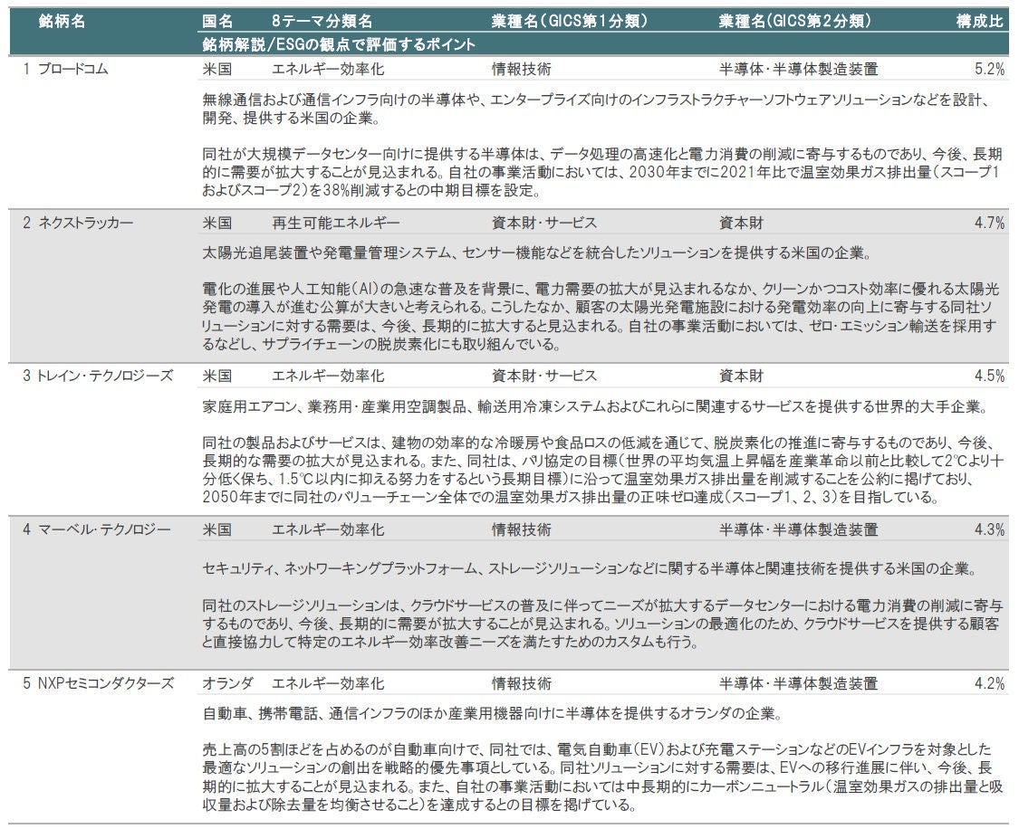 ※上記組入銘柄は、特定の銘柄の勧誘や売買の推奨等を目的としたものではなく、その価格動向を示唆するものでもありません。銘柄名の後の括弧内は8テーマ分類名および業種名(GICS第1分類)です。