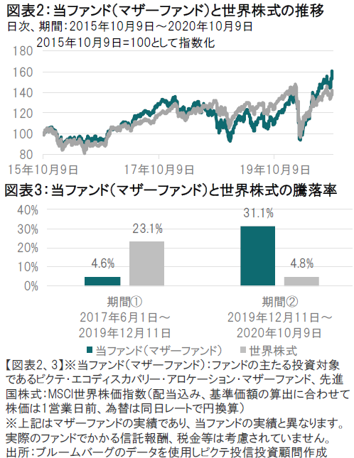 一方、この流れを転換させた象徴的な出来事が、2019年12月11日の欧州委員会による「欧州グリーン・ディール」の公表でした(なお「欧州グリーン・ディール」は、新しい欧州委員会の発足前から注目されはじめていました。)。2019年12月11日以降では、当ファンド(マザーファンド)と世界株式のパフォーマンスは逆転しています(期間②)(図表2、3参照)。