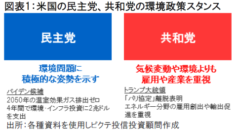 一方、民主党はこれまで環境政策に積極的な姿勢を示してきました。オバマ前大統領時に「パリ協定」が採択されたことがそのことを物語っています。そして今、もっとも注目されるのが、トランプ大統領と大統領選挙で争うバイデン候補が、2020年7月に発表した行動計画の中で、4年間で環境・インフラ投資に2兆ドルを充てるなど、積極的な環境インフラ政策を公表したことです。