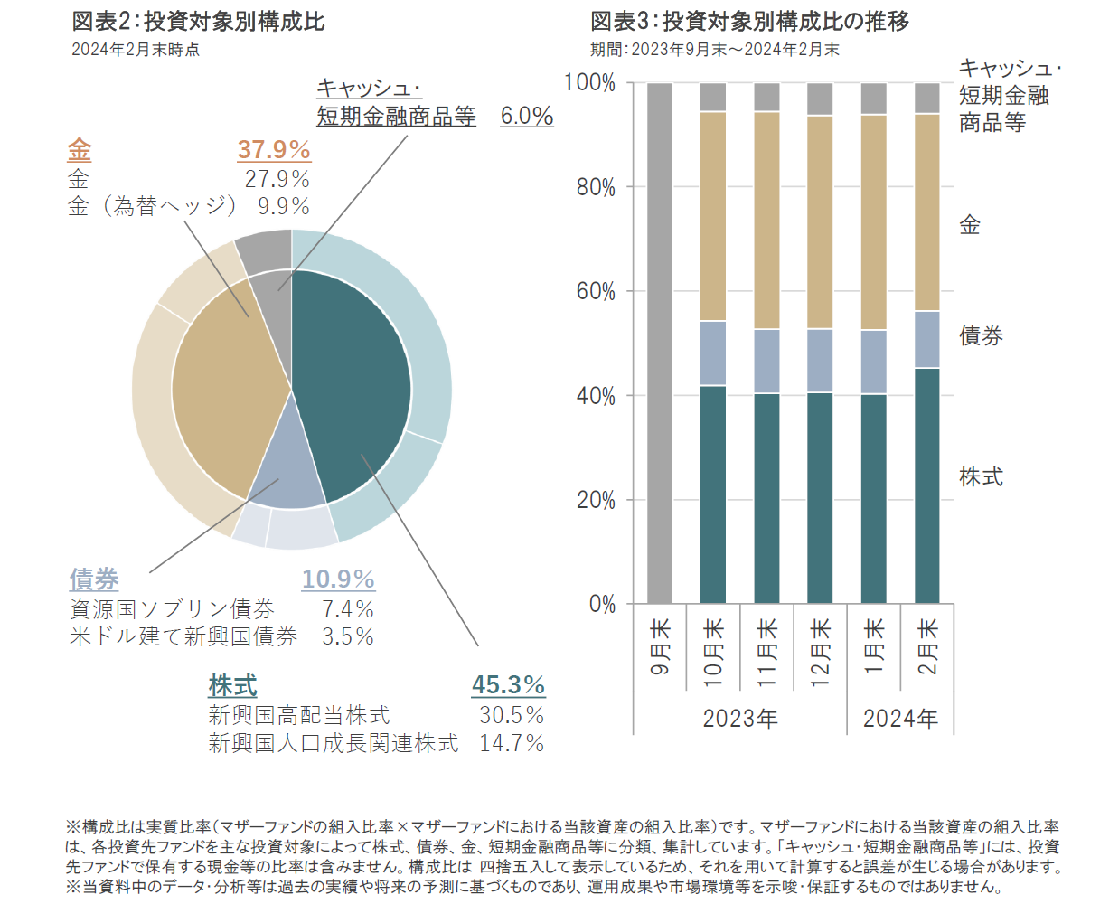 2024年2月には、高値警戒感がある中でも、株式市場の上昇トレンドは今しばらく持続する可能性があると判断し、株式を中心にリスク資産に対する強気スタンスを若干強めたことから、2024年2月末時点の組入比率は、株式45.3%、金37.9%、債券10.9%、キャッシュ・短期金融商品等6.0%となっています(図表:2)。