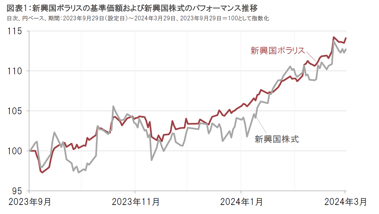 新興国ポラリス(以下、当ファンド)の基準価額は、設定日(2023年9月29日)から足元までのおよそ6ヵ月間で+14.1%の上昇となりました。当ファンドは、新興国資産に金を組合わせ、市場環境によって機動的に資産配分を変更することで、リスク低減とリターンの向上を目指します。当該期間において、新興国株式を上回るパフォーマンスとなったほか、金の組入れ効果も相まって、新興国株式のみの投資よりも価格の変動幅を抑えることができました(図表1)。