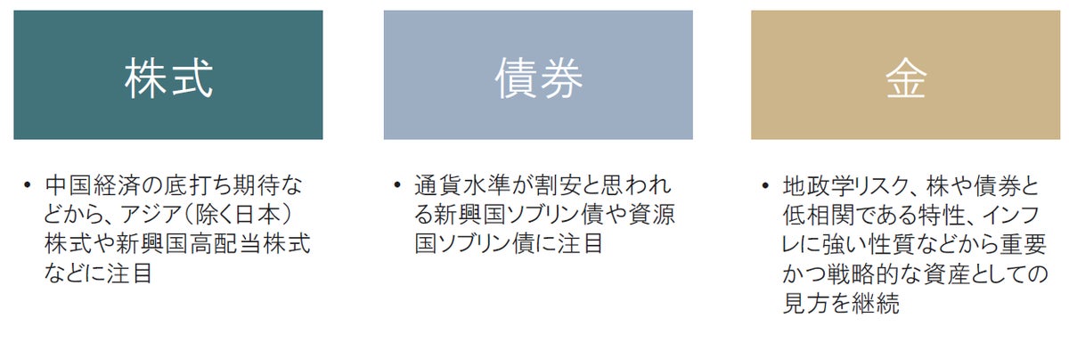 足元の世界経済は、米トランプ政権の政策不透明感に翻弄される展開が継続していますが、依然として米国経済の底堅さが意識されるほか、欧州や中国では景気底入れ感が見られるなど、強気材料も見られるため株式全体の組入比率を引き上げました。一方で、インフレや地政学リスクなどに起因する市場のテールリスクに配慮し、金の組入比率も引き上げ、反対に債券の組入比率を引き下げました。なお、株式部分では中国経済の底打ち期待などから、アジア(除く日本)株式や新興国高配当株式などに注目します。債券については、米国の保護主義的な政策に警戒しながらも、通貨水準が割安と思われる新興国ソブリン債や資源国ソブリン債に注目していきます。為替については、日銀による継続的な利上げが意識されるほか、有事の際に円が買われるシナリオなども視野に入れ、一段の円ヘッジの引き上げも検討します。金については、地政学的リスクの高まりが意識される中で、伝統的資産に対する低い相関をもつことなどから戦略的資産として保有を継続します。