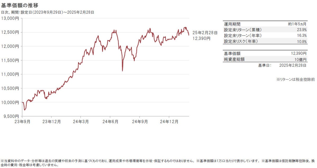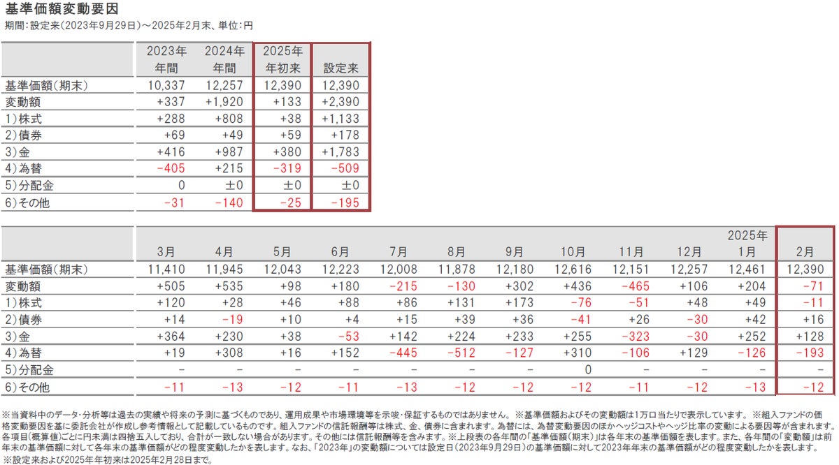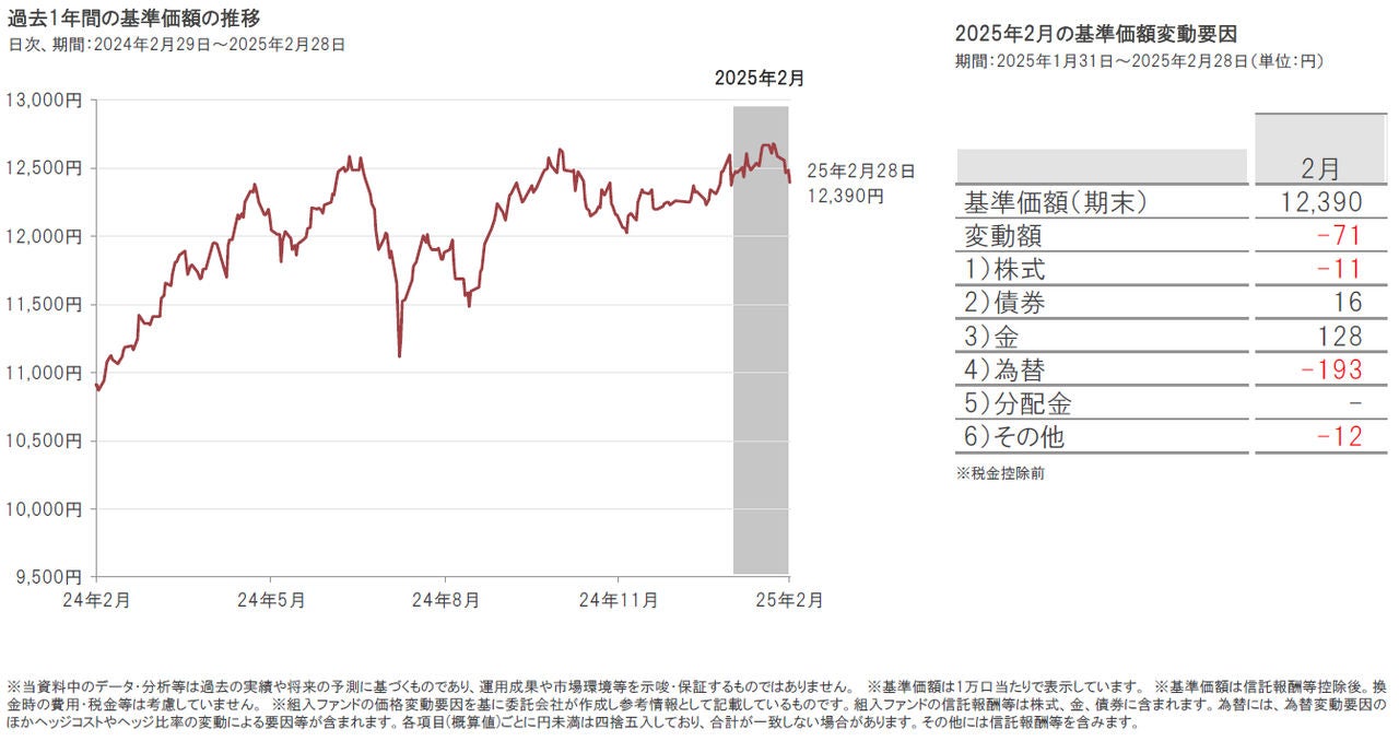 2025年2月28日の新興国ポラリスの基準価額は12,390円となり、前月末比で71円下落(-0.6%)しました。