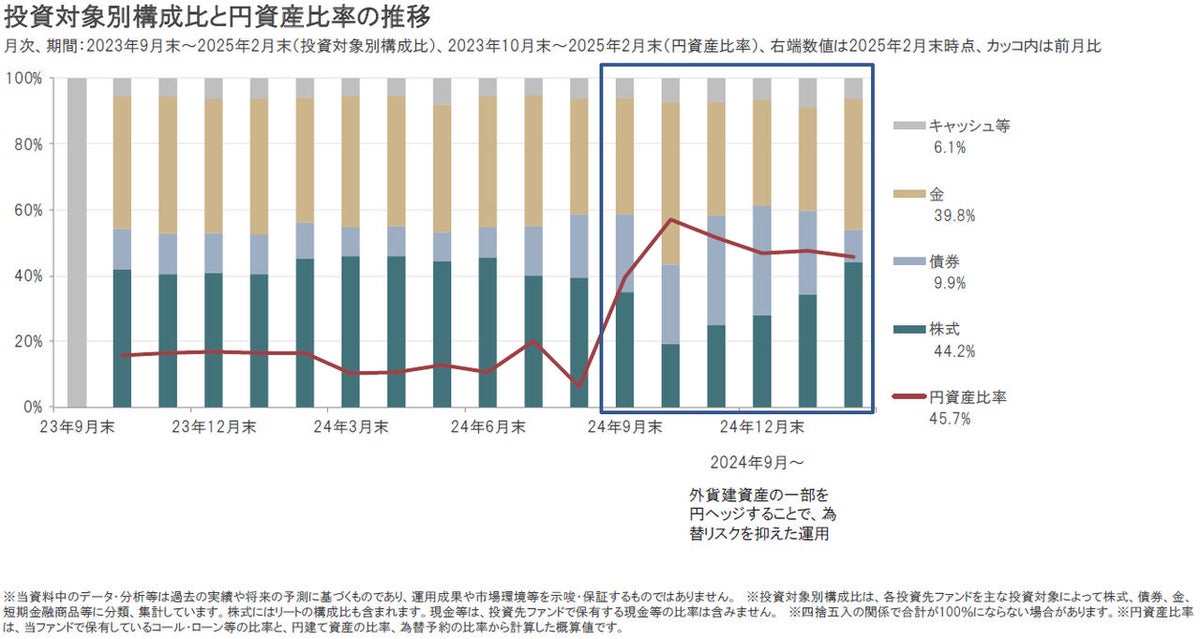 また円資産比率(円建て資産と円ヘッジの外貨建資産比率)は、2024年9月以降、引き上げており、為替リスクを抑えた運用を行っています。