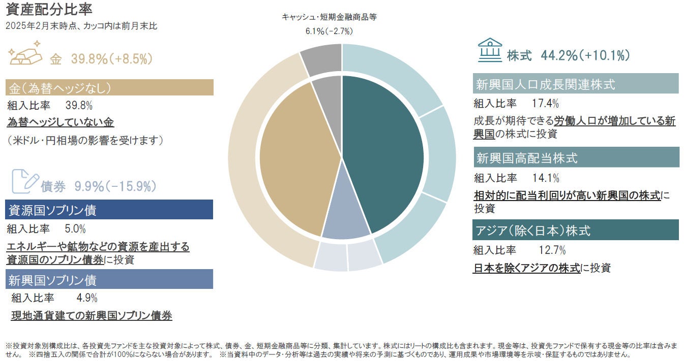 新興国ポラリスでは、2025年2月末現在、株式を45%程度、金を40%程度、債券を10%程度、組入れています。