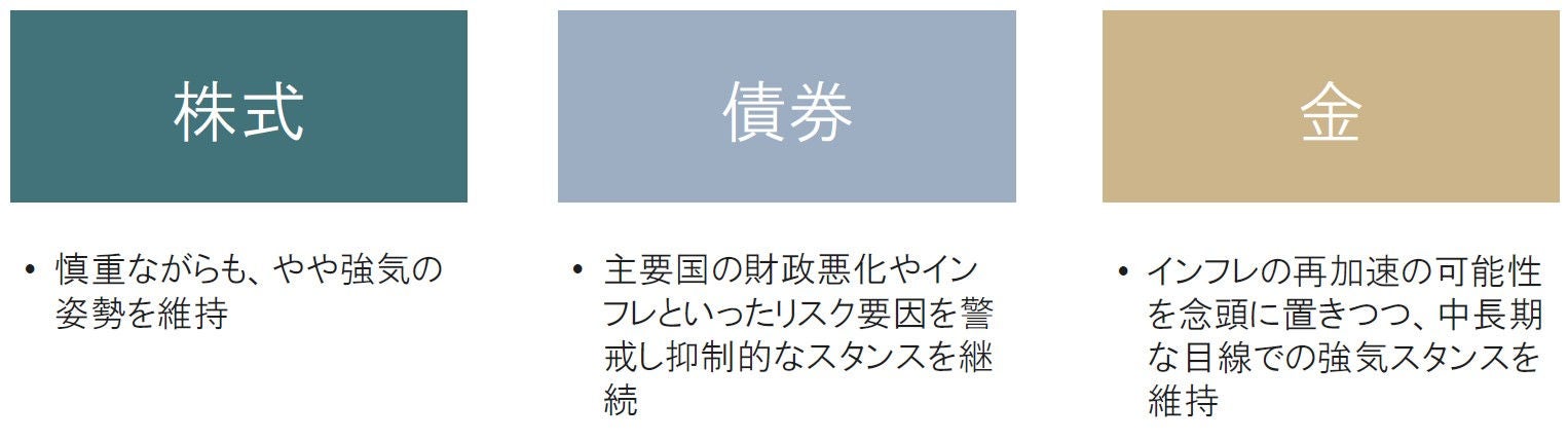このため、株式については慎重ながらもやや強気な姿勢を維持する方針です。債券は主要国の財政悪化やインフレといったリスク要因を警戒し抑制的なスタンスを継続します。為替については、引き続き米国経済の急減速などを背景に円高が進行するリスクもあるため、ある程度の為替ヘッジを維持します。金に関してはインフレの再加速の可能性を念頭に置きつつ、中長期な目線での強気スタンスを維持する方針です。