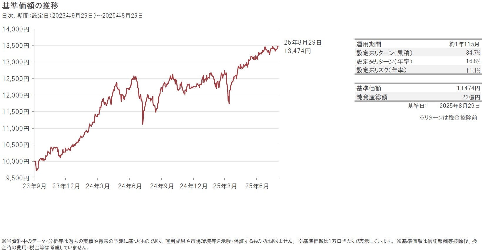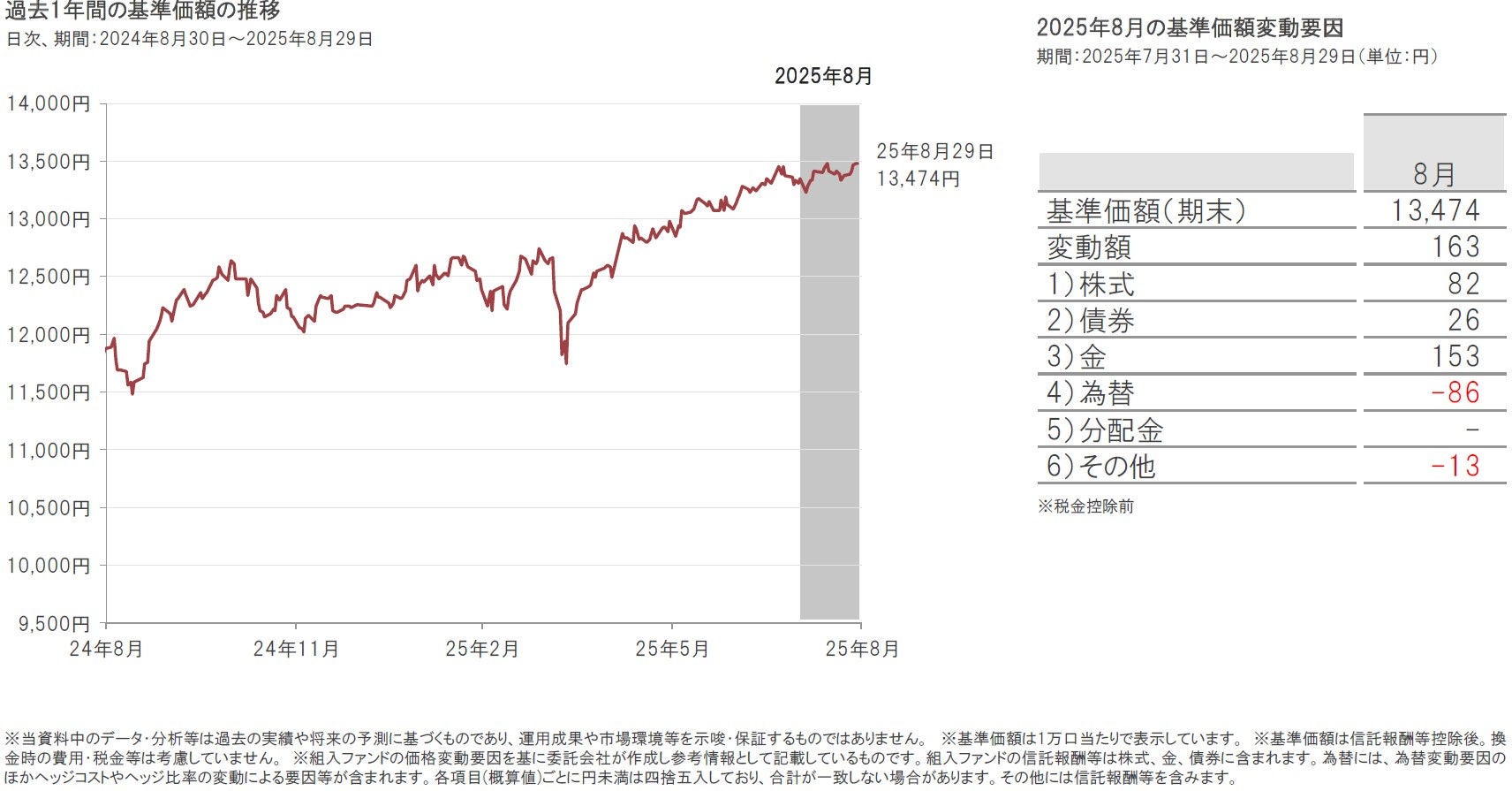 2025年8月29日の新興国ポラリスの基準価額は、前月末比163円上昇(+1.2%)の13,474円となりました。