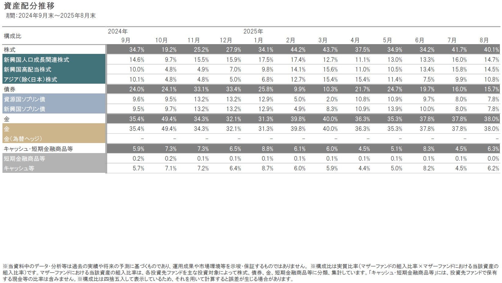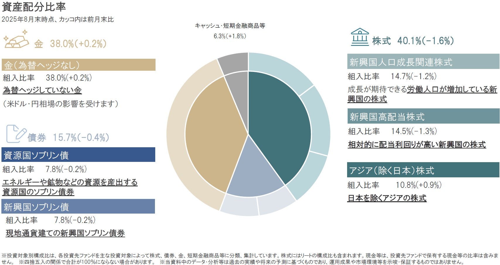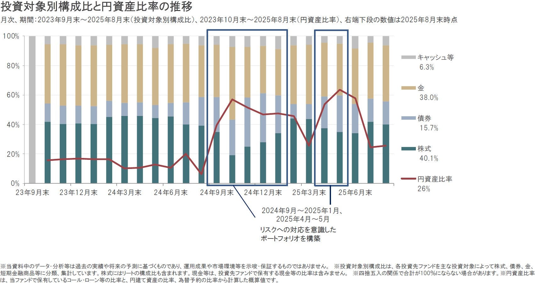 2025年8月末の組入比率は、前月末比でキャッシュ等、金を引き上げた一方、株式、債券を引き下げましたが、大きな資産配分の変更はありませんでした。また、円資産比率(円建て資産と円ヘッジの外貨建て資産比率)は、2025年8月末時点で26%としています。