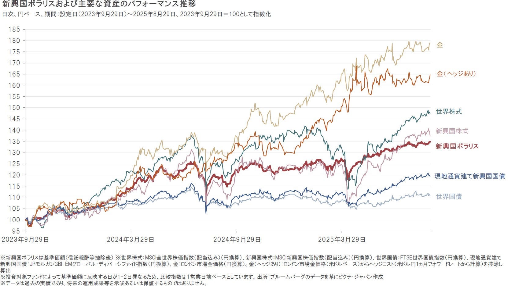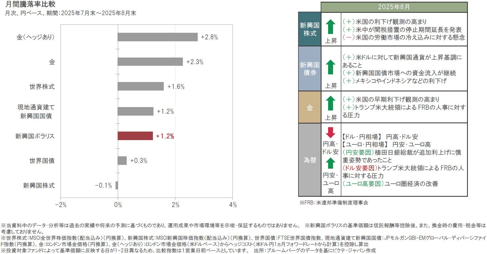 2025年8月は、現地通貨ベースでは金、世界株式、現地通貨建て新興国国債、世界国債、新興国株式がともに上昇しました。また為替市場では、円がドルに対して上昇した一方、ユーロに対しては下落しました。