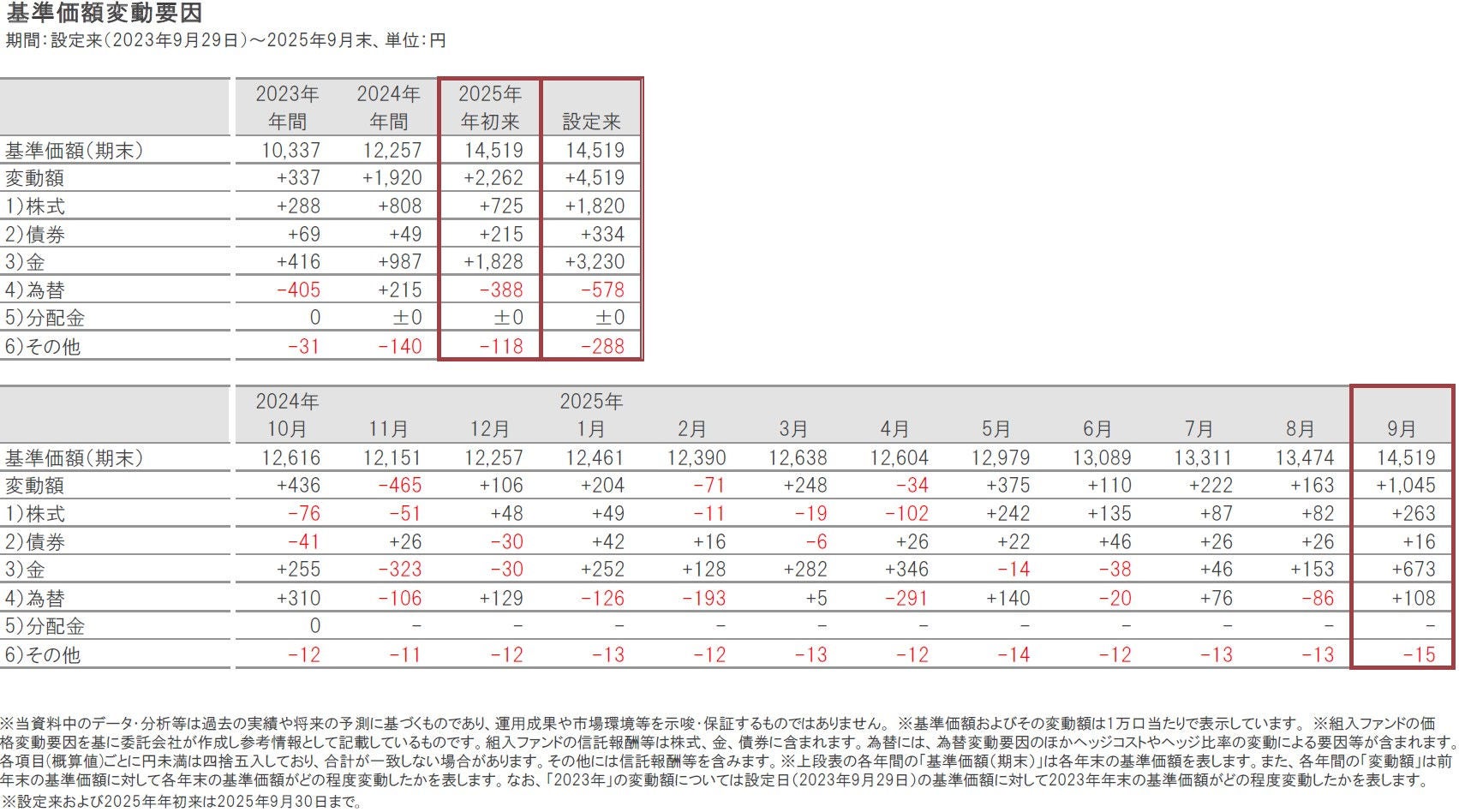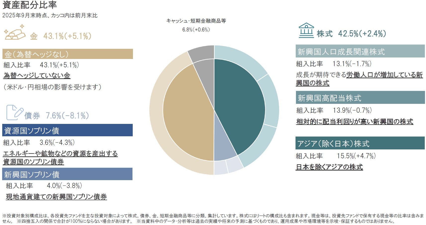 2025年9月末の組入比率は、前月末比で金、株式、キャッシュ等を引き上げた一方、債券を引き下げました。また、円資産比率(円建て資産と円ヘッジの外貨建て資産比率)は、2025年9月末時点で前月末とほぼ変わらず26%としています。