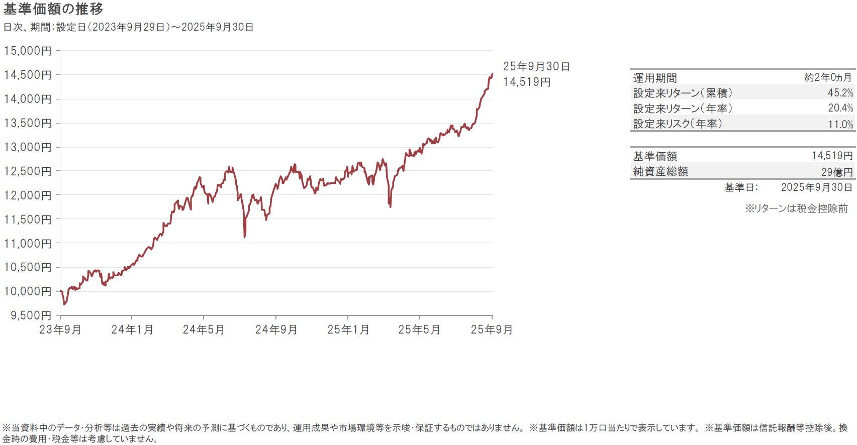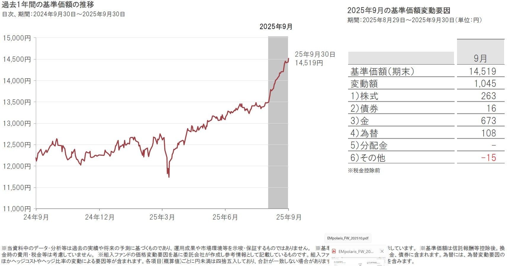 2025年9月30日の新興国ポラリスの基準価額は、前月末比1,045円上昇(+7.8%)の14,519円となりました。