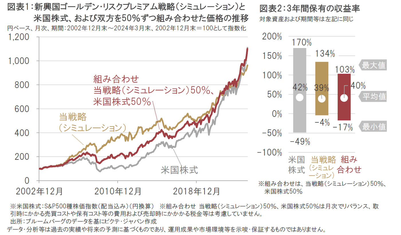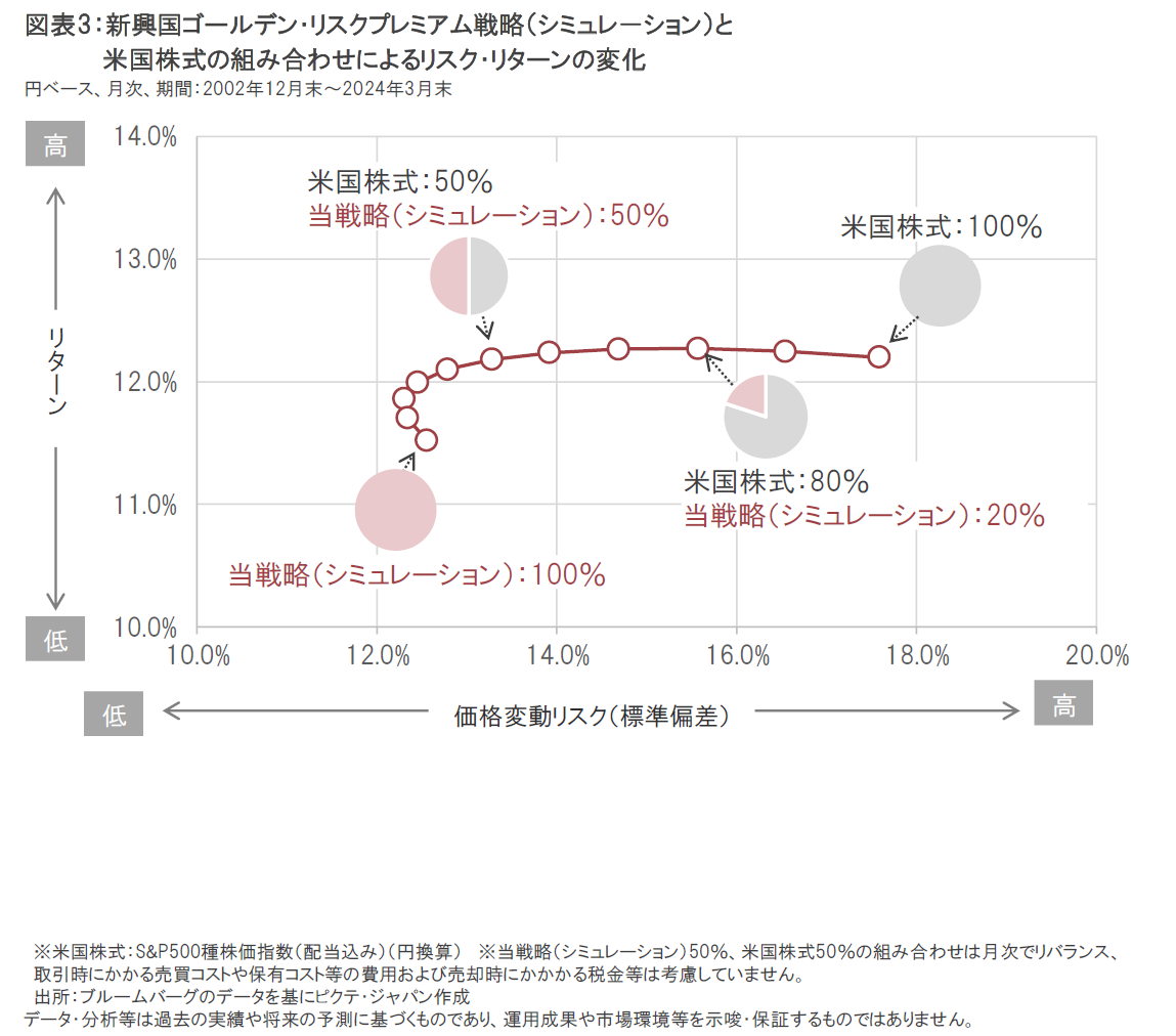 長期的なパフォーマンス特性を考える上で、当ファンドの運用の考え方に準拠して試算した新興国ゴールデン・リスクプレミアム戦略(以下、当戦略)を用いた、米国株式と組み合わせシミュレーションが以下です。