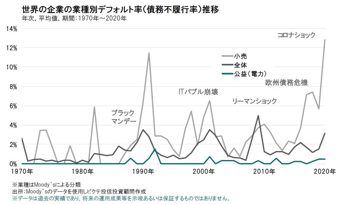 コロナショックで企業債務が増大するなか、2020年には同ショックでマイナスの影響を受けやすかった小売業などを中心に世界的にデフォルト(債務不履行)率が3.1%と、ブラックマンデーやITバブル崩壊後の水準まで上昇しました。金額では2020年の債務不履行の合計額(格付け機関のMoody’s集計)は、およそ2,336億ドルとリーマンショックの影響を受けた2009年の3,343億ドルに次ぐ高水準となっています。