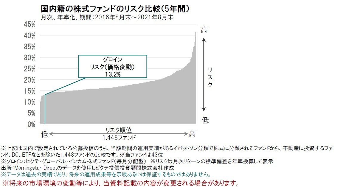 グロインのリスク(価格変動)は主要株式のなかでは相対的に低く、国内で設定されている株式を投資対象とするファンドのなかでも、リスクが最低水準のファンドのひとつです。