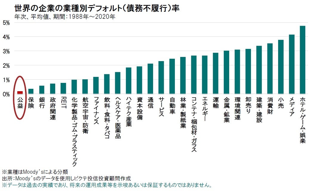公益企業は日常生活に必要不可欠なサービスを提供するため、収益基盤がしっかりしています。このため、過去の実績では、公益企業のデフォルト(債務不履行)率は、様々な業種のなかで最低水準となっています。