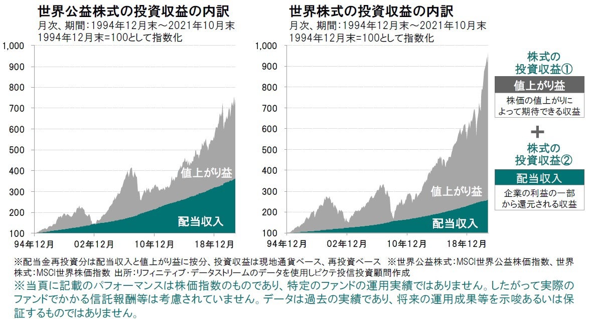 株式の投資収益の源泉は、値上がり益と配当収入です。過去の実績では世界公益株式の株価は市場環境によって変動しましたが、配当収入は着実に積み上がり全体の投資収益を下支えしました。また、世界公益株式の投資収益に占める配当収入の割合は、世界株式と比較して大きくなっており、価格変動が世界株式と比べて小さくなる一因となっています。