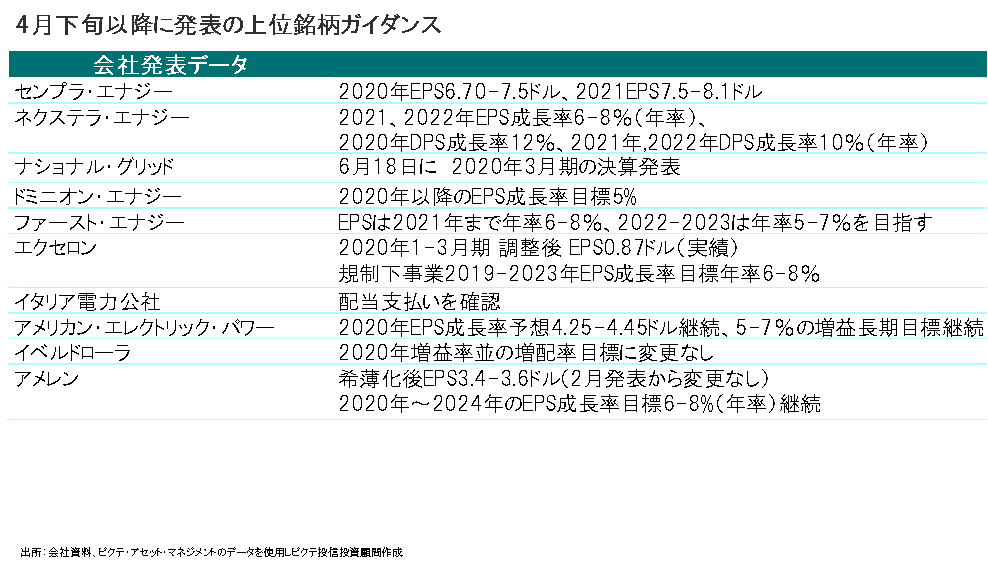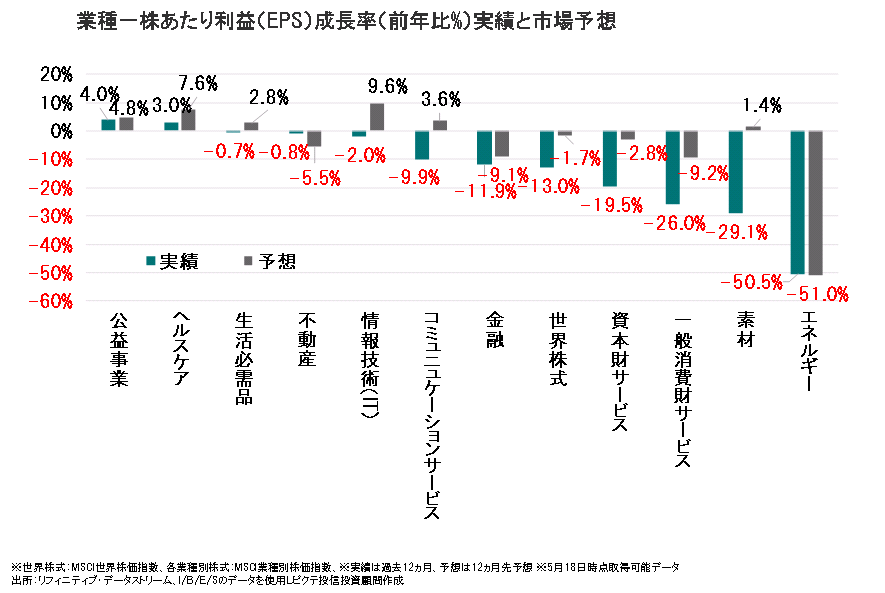 世界の公益企業の利益成長率は足元の実績で前年比約4%、予想(12ヵ月先)で同約4.8%(2020年5月18日時点取得可能データベース)となっており、原油価格の下落や景気後退の影響が大きいエネルギーや一般消費財サービスなどの実績が2桁のマイナスとなり、今後も減益が予想されるなか、公益をはじめとするディフェンシェブ性(景気の変動に左右されにくい特性)の高い業種や新型コロナウイルス関連の医薬品の適応拡大や承認が期待されるヘルスケアセクター、テレワークの拡大の恩恵を受ける情報技術(IT)セクターなどが底堅く推移することが予想されています。