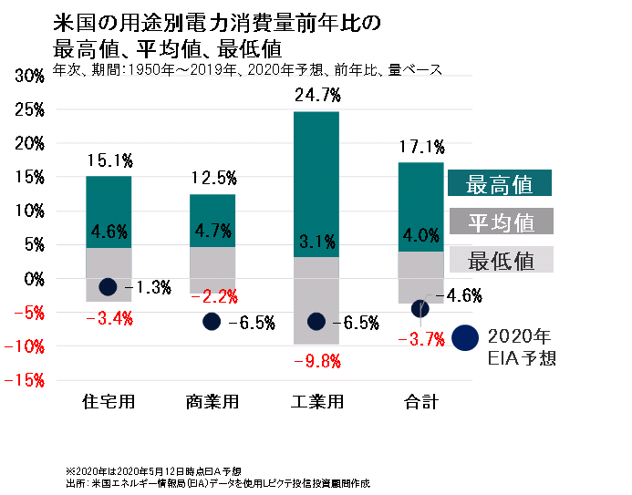 なお、米国エネルギー情報局(EIA)は2020年4月7日に新型コロナウイルス感染拡大により、必要不可欠ではないビジネスが一時閉鎖され、多くの人が在宅勤務を行っている状況が数カ月続くとして、2020年年間で電力消費量は4.6%減少するとの見通しを発表しました。特に影響の大きい商業用では6.5%、工業用では6.5%の減少を見込んでおり、住宅用需要は在宅勤務等により増加するものの、例年より温暖な冬場や予想される今後の穏やかな気象による需要減により全体として-1.3%減になるとしています。