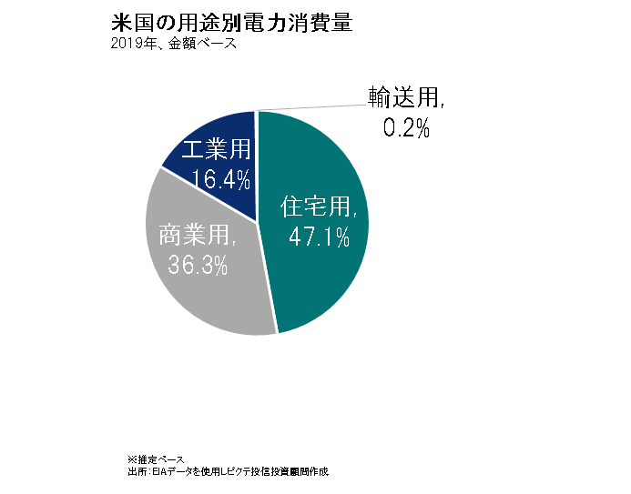 【理由2:工業・商業用需要減を住宅用需要増が相殺】 理由の2つ目は、工業用や商業用の電力需要は減少が予想される一方、住宅用の需要増が予想されるため、需要全体が大きく減少しないと考えられるからです。現在、当ファンドの国別構成の約7割を占める米国の電力のなかで景気後退の影響を最も受けやすい工業用需要は料金単価が住宅用よりも低く金額ベースにすると約16%となります。一方、景気の影響を受けにくい住宅用需要は約47%となります。このため需要の変化による公益企業の収益全体へのマイナスの影響はそれほど大きくないと考えられます。
