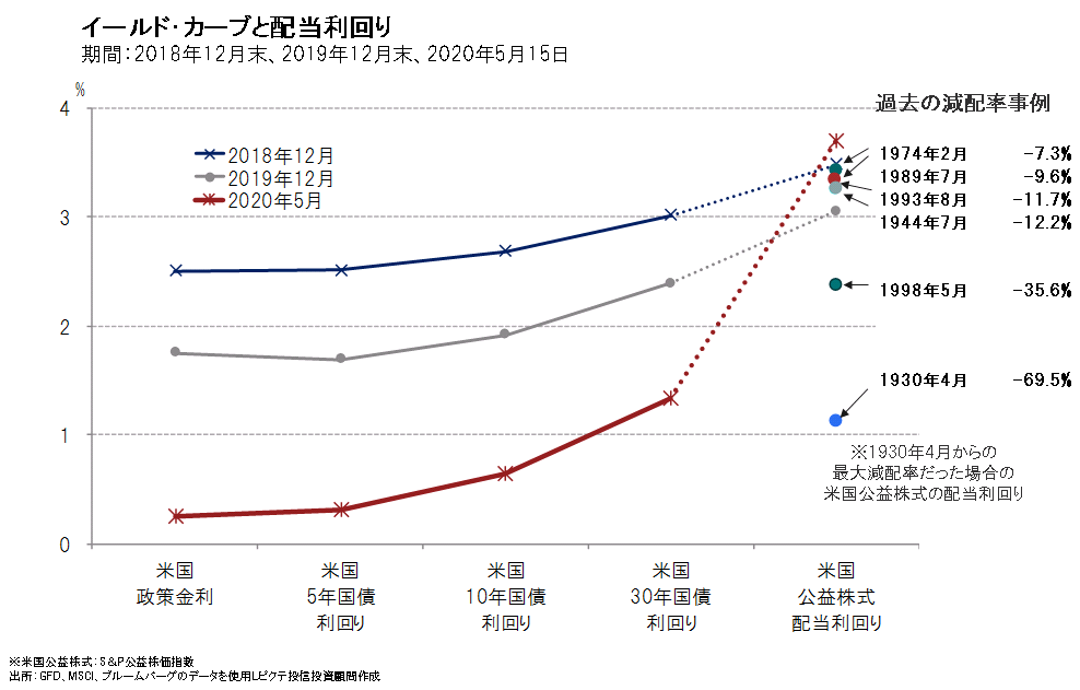 一方、新型コロナウイス感染拡大による景気悪化の影響を緩和するため、米国連邦準備制度理事会(FRB)をはじめ世界の主要中央銀行がリーマンショック時を上回る規模の流動性供給拡大を打ち出しており、安全資産とされる米国国債をはじめとした主要先進国国債の利回りは、過去最低水準で推移しています。このため、米国の公益株式の配当利回りは、過去最高の減配率となった場合でも、依然相対的に魅力的な水準となるとみられ、今後の株価下支え要因になると考えられます。