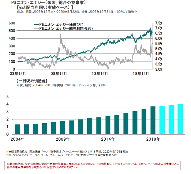 このため、同社の電力需要は感染拡大によるマイナスの影響は受けていないとしています。実際に、季節調整後ベースで3月や4月の電力需要(前年同月比)は増加しています。仮に需要が減少したとしても、規制下では、需要の減少に応じて電力料金も調整できるなどの仕組みがあるため、利益への影響は限定的です。 また、2020年1-3月期の四半期決算発表時にドミニオン・エナジーはバージニア州でのクリーン・エネルギー事業拡大の長期計画の概要を示しました。同社はクリーンエネルギー技術の投資を5年間の設備投資計画に組入れました。 このため計画的な設備投資拡大による資産規模拡大は、規制下事業下においては利益増につながり、安定した配当増加が期待できることになります。