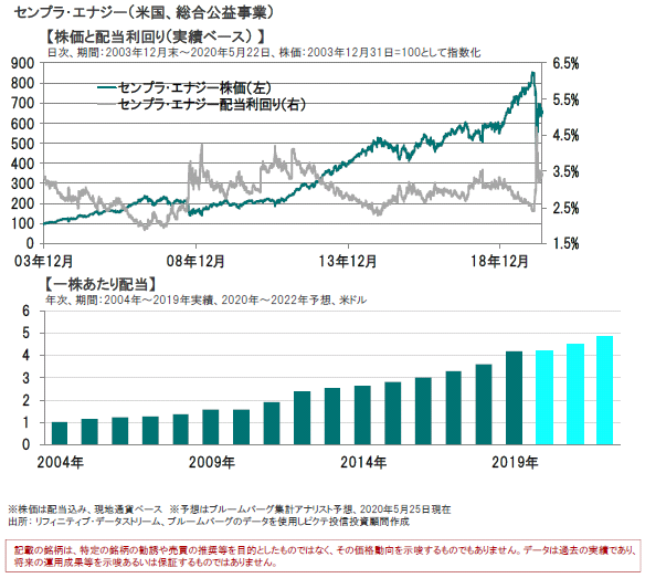 今回は、当ファンドの保有上位10銘柄中、4月中旬以降決算を発表したセンプラ・エナジー、ネクステラ・エナジー、ドミニオン・エナジーを紹介します。この3社は安定した規制下事業の収益を背景に、景気後退局面でも、公益企業のなかでも特に安定した配当を継続してきた企業です。とりわけ、リーマンショックなど過去の景気後退期でも、安定した配当を継続してきました。今回のコロナショックの局面でも、業績は底堅く、増益・増配見通しを継続して発表しています。 足元でも、安定した配当を継続するなか、株価の下落を受けて、配当利回りは大きく上昇し、魅力が高まりました。