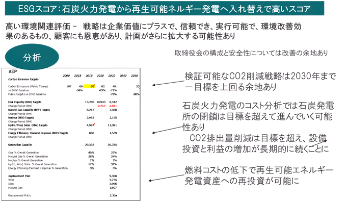 こちらは、ESGで注目のアメリカン・エレクトリックパワー(米国、電力)の分析例です。同社は、石炭火力発電から再生可能エネルギー発電への入れ替えを目指しており、この点で高いスコアとなっています。ESGのなかの、環境関連評価では、同社のこの戦略は企業価値にプラスで、信頼でき、実行可能なもので、環境改善効果があり、顧客にも恩恵があり、計画が更に拡大する可能性があるとみています。特に、検証可能な二酸化炭素(CO2)削減戦略は2030年まで目標を上回る余地があるなどの項目が評価されています。
