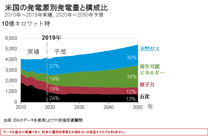 世界の公益株市場の5割以上を占める米国の電力の発電源別構成比では、再生可能エネルギーによる発電の比率は2019年の19%から2050年には38%まで拡大すると予想されています。