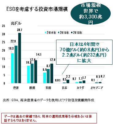 ESGを考慮する投資市場規模は、2016年から2018年までの2年間で、世界全体では34%増加し、30.7兆米ドルとなりました。年平均にすると16%成長しました。過去の成長率では、2012年から2014年が61%成長、2014年から2016年が25%成長、2016年から2018年が34%成長と増加しました。