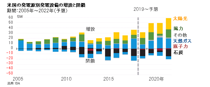 太陽光、風力などのクリーンエネルギーによる発電は、石油、天然ガス、石炭などの化石燃料や原子力と比べて経済的に優位な発電手段になっていくと考えられます。実際に米国ではここ10年余りで従来型の石炭や原子力が閉鎖され、太陽光や風力などの発電設備が増設されてきています。また、今後もこのトレンドが継続することが予想されています(下図参照)。米国でクリーンエネルギーが増加するというこの傾向は、世界規模でも見られており、主たる発電源がクリーンエネルギーにシフトしていく流れが継続すると見ています。次頁で米国でクリーンエネルギーによる発電を積極的に進める電力会社をご紹介します。
