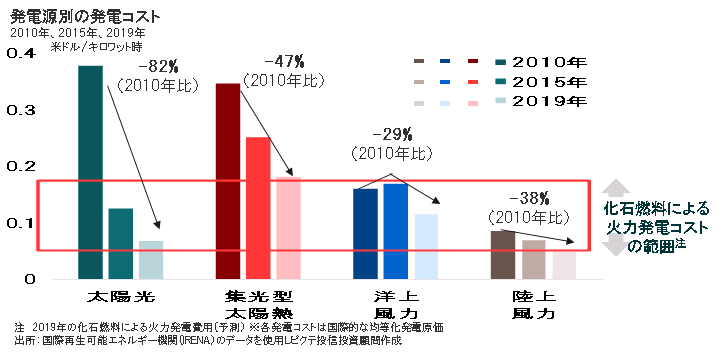 地球温暖化対策など環境重視の政策や技術革新・設備の大規模化により、クリーンエネルギーである太陽光や風力などの再生可能エネルギーの発電コストは設備投資コストや運営コストでみても大幅に低下しています。石油や天然ガス、石炭などの化石燃料による発電コストと同等かそれ以下に低下するほど競争優位性を増しています。このため公益企業が太陽光や風力発電を拡大する際には、補助金や政府の支援にもはや頼る必要がなくなってきています。