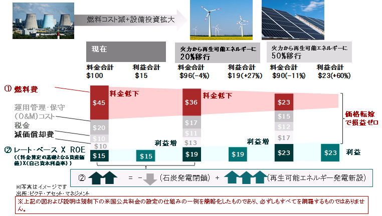 一般的家庭が電力料金を現在100ドル払っているとします。 その内訳をみると、①燃料費の45ドルをはじめとした費用部分が85ドルです。この85ドル部分はそのまま価格転嫁で電力会社の儲けになりません。これに、②レートベースつまり電力の料金算定の基礎となる資産価値に利益率、ROEを掛けて算出される15ドルが会社の利益です。これを上乗せしたものが現在の電力料金の100ドルとなります。電力の料金算定の基礎となる資産価値は新しい施設が増えるほど増加し、古い施設が増えると、原価償却が進むことで資産価値が減少します。