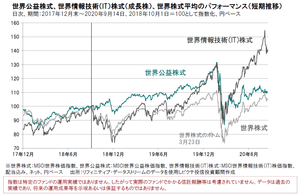世界情報技術(IT)株式はコロナショック前の高値を更新する一方、世界株式やコロナショック前までは相対的に堅調であった世界公益株式は高値を更新するまでには至っていません。