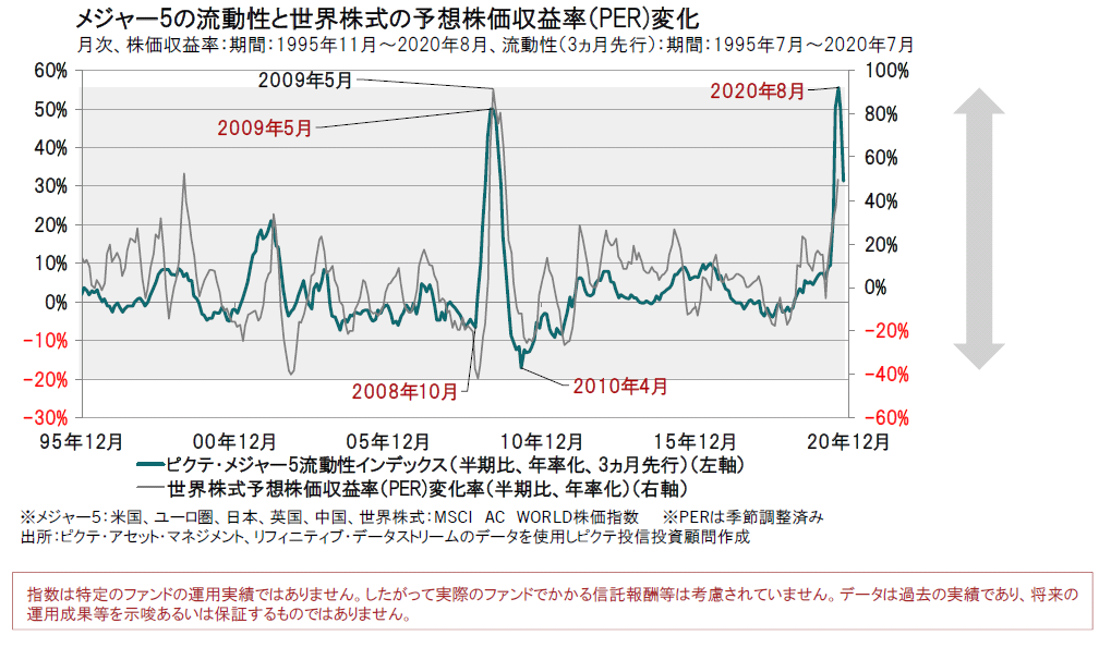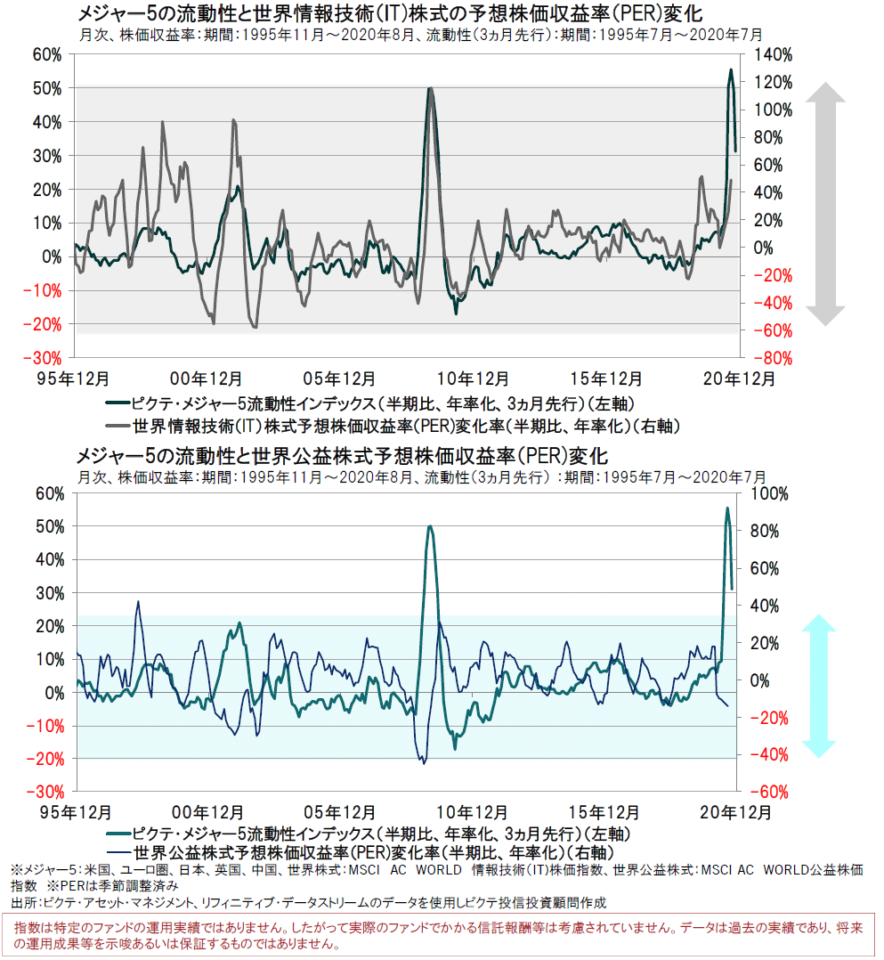 過去の実績では、世界情報技術(IT)や一般消費財サービスなどの景気敏感な業種は、流動性の変化と株価収益率(PER)の変化との相関(連動性)が高くなっています。市場への流動性供給が拡大し、景気回復期待が高まると、景気敏感な業種により資金が流れやすくなることが一因と考えられます。