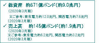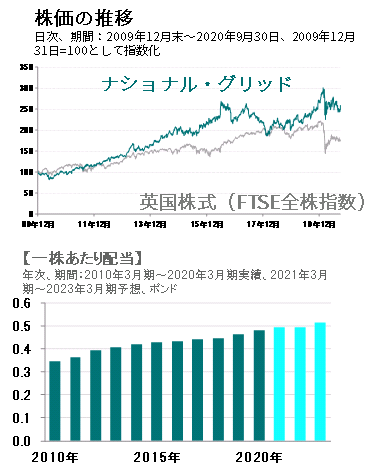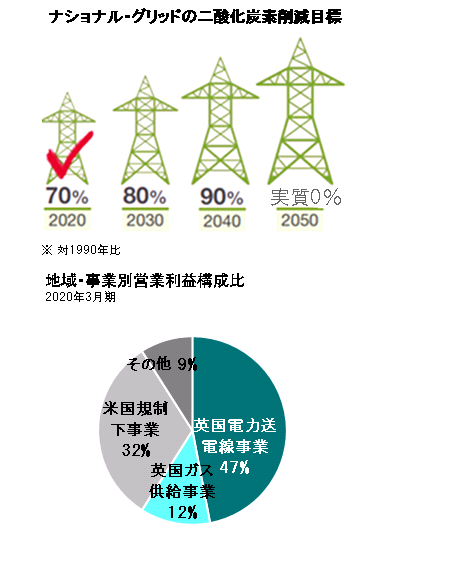 ナショナル・グリッドは、英国・ロンドンに本拠を置く欧州の上場企業であり、電力・ガス事業を展開する最大級の公益事業会社です。当社は、1990年に英国の電力事業民営化により設立され、2000年代に入ってからの英国と米国での企業買収により、事業を拡大してきました。当社2020年3月期決算における営業利益の93%は、英国・米国での規制下事業によるものです。営業利益の残り7%は、新規のナショナル・グリッド・ベンチャーズ事業です。 現在、英国での電気・ガス供給事業では、イングランドとウェールズ全域を網羅する国内最大の電力・ガス供給網を保有しています。英国の規制下事業の資産総額は、200億ポンドを超えています。米国では、米国北東部にガス供給、配電、送電などの資産を保有する国内最大級の民間公益事業会社です。米国事業全体での規制下事業の資産総額は、250億ドル強となっています。 残りの、ナショナル・グリッド・ベンチャーズ事業では、米国での大規模な再生可能エネルギー発電事業で太陽光・陸上風力発電所を建設・保有しています。また英国と欧州間の海底電力相互接続を行っています。 英国・米国共に、当社の電力・ガス供給事業は、現地規制当局によって規制されており、インフレを反映した料金設定が考慮されるなど、インフレに対する一定の保護策が取られています。また、ナショナル・グリッド・ベンチャーズ事業は大部分が長期契約です。 こうした事業形態のため、 1)既存資産に投資して、信頼性と耐性の高いネットワークを維持し、2)イノベーションとパフォーマンスを促進するインセンティブを含め、新たな資産に投資しながら、3)魅力的な自己資本利益率(ROE)を確保することがでます。このため、事業の見通しがしっかりしており、当社の事業は安定したキャッシュフローを生み出すことができ、株主への配当を継続し、着実に増加させることが可能となっています。現在、グループ全体で年間約50億ポンドの投資を行い、また現在の信用格付け水準を維持し、英国のインフレ率を十分織り込んだ水準の増配を行いながら、引き続き年率5~7%のグループ資産の成長を目指しています。