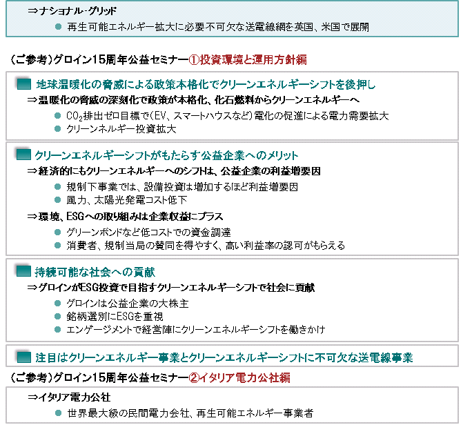 地球温暖化の脅威による政策の本格化はクリーンエネルギー拡大を後押ししています。クリーンエネルギーシフトは公益企業へのメリットをもたらします。①発電コスト低下は利益増要因、②環境にもやさしい取り組みはESG評価を高め、企業収益にプラスです。公益株式に投資するファンドのなかで世界最大級のファンドであるグロインはESG評価を重視しており、企業へのエンゲージメント(対話)を通じて、グリーンエネルギーシフトを働きかけ、持続可能な社会に貢献していきます。本レポートでは、再生可能エネルギー拡大に必要不可欠な送電線網を英国、米国で展開するナショナル・グリッドについてご紹介します。