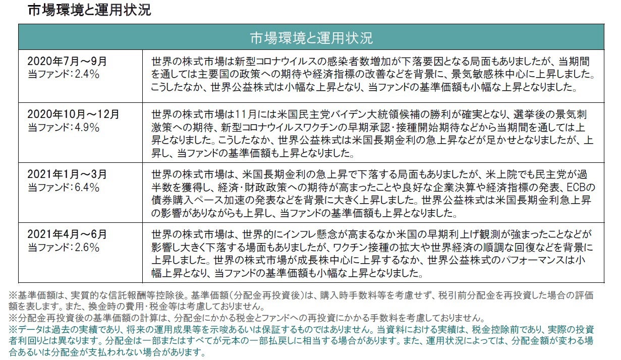 2021年4月~6月にかけては、世界の株式市場は、ワクチン接種の拡大や世界経済の順調な回復などを背景に成長株中心に上昇するなか、世界公益株式のパフォーマンスは小幅上昇となり、当ファンドの基準価額も小幅な上昇となりました。世界景気回復期待と共に物価が上昇傾向にあり、利上げが視野に入ってきています。1998年以降でこのような局面では世界公益株式は株式市場全体とともに上昇する傾向が見られました。