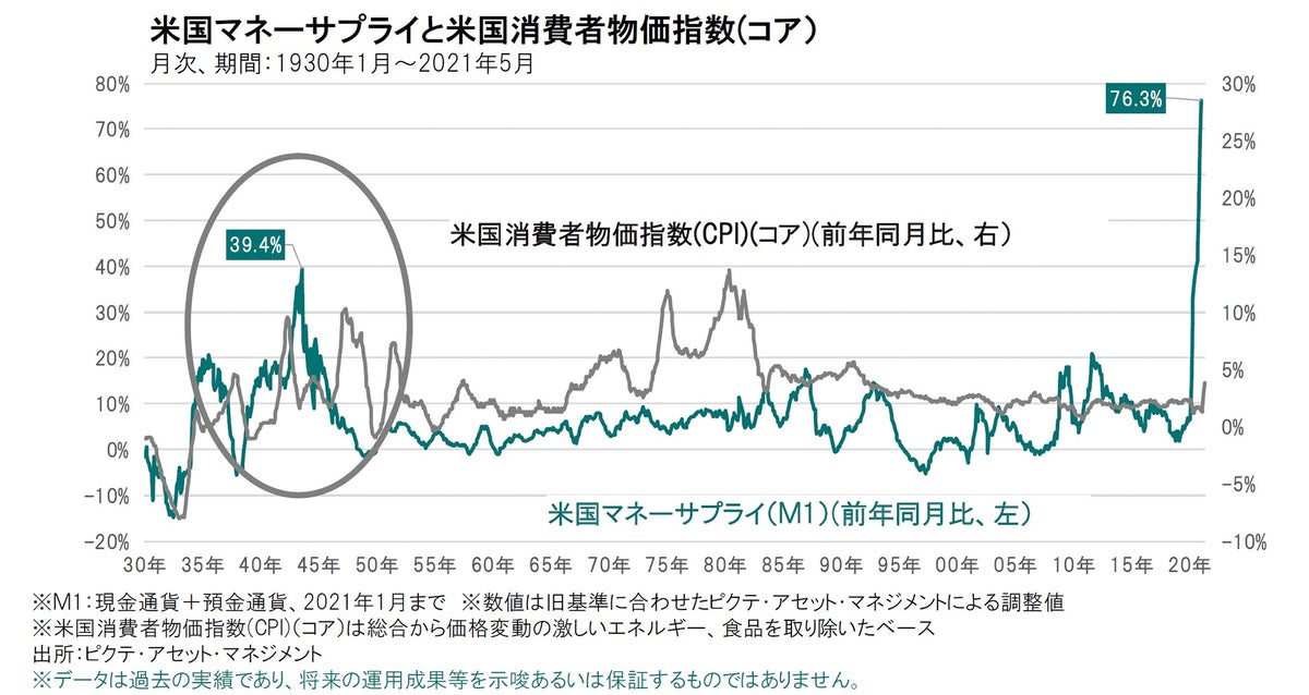 米国の例でみると、1930年以降の実績では1970年代のオイルショック時を除いてみると、金融緩和による流動性供給の拡大は物価上昇圧力となり、物価が上昇しています。現在、金融緩和策により、流動性供給は1943年8月以来の最高水準に達しており、貨幣面からは潜在的な物価上昇圧力が高い状況にあると考えられます。