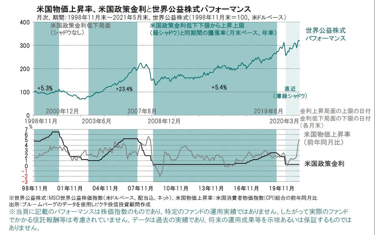コロナショック後の経済の正常化とともに、米国では物価が上昇し、金融政策変更の可能性が議論されています。1998年以降の実績では世界公益株式は金利が急上昇する局面では一時的に調整しましたが、米国政策金利が据え置きあるいは引き上げられている景気底入れや景気回復の場面では、物価が上昇するなか、株式市場全体とともに世界の公益株式は上昇する傾向が見られました。