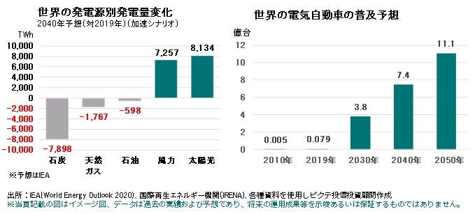 ピクテでは、「グリーンシフト」が二つの「波」で構成されると考えます。現在は、「第一の波」、即ち、「グリーン化(脱炭素化)の波」、のさなかにあると考えます。これは、発電時の二酸化炭素(CO2)排出量の削減を進める局面です。左下図にあるように石炭や天然ガス発電が年々減少する一方で、風力や太陽光発電は大幅な増加が予想されています。こうした状況が「第一の波」をけん引しています。「第一の波」は強力で、今後10年前後、継続することが予想されます。