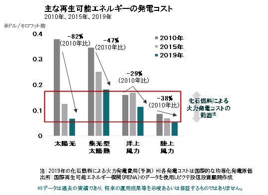 2つ目は、イノベーション(技術革新)や普及拡大による規模の経済効果によって風力発電や太陽光発電ならびに蓄電池のコストが石炭などの化石燃料による発電コスト並あるいはそれ以下に大幅に低下したため、化石燃料に替えてグリーン(再生可能)エネルギーを使うことで公益企業の収益が改善される状況になっている点です。