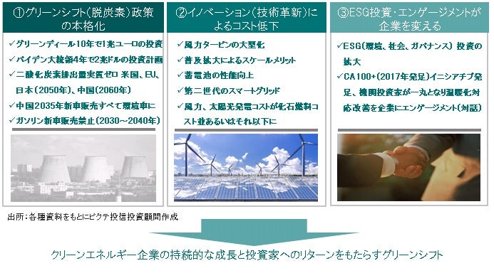 地球温暖化の脅威に対応するためクリーンエネルギー政策が本格化するなかで、風力・太陽光による発電コストの低下がクリーンエネルギーの拡大を後押ししています。この「グリーンシフト」には複数の成長のけん引役(ドライバー)がありますが、公益企業が地球環境のために正しい行動を取ること(地球環境に配慮して行動すること)によって、結果として投資収益の向上に資すると考えます。