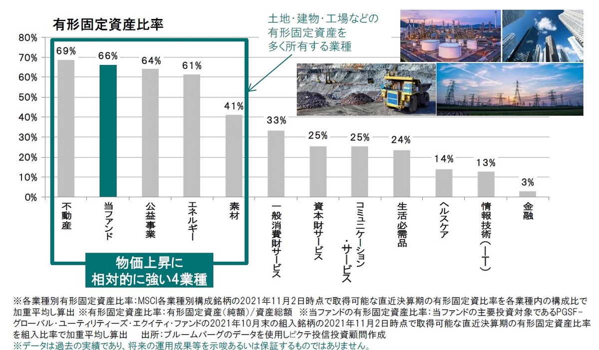 商品価格や物価の上昇時の業績や株価が相対的に堅調だった業種について、20年余りの実績でみると、土地、建物、工場などの実物資産、つまり有形固定資産を多く保有する業種があげられます。具体的には、土地や建物を所有していたり、石油や鉄鋼などを在庫としてもっていて、その価格の値上がりの恩恵をうける、不動産、エネルギー、素材といった業種です。発電設備、送電網などの有形固定資産を持つ公益もこの一つにあげられます。これらの業種は、総資産に占める有形固定資産の比率が相対的に高いことが特徴です。当ファンドの主な投資対象は公益企業の株式であり、当ファンドの構成銘柄の有形固定資産比率の平均値も相対的に高い水準となっています。